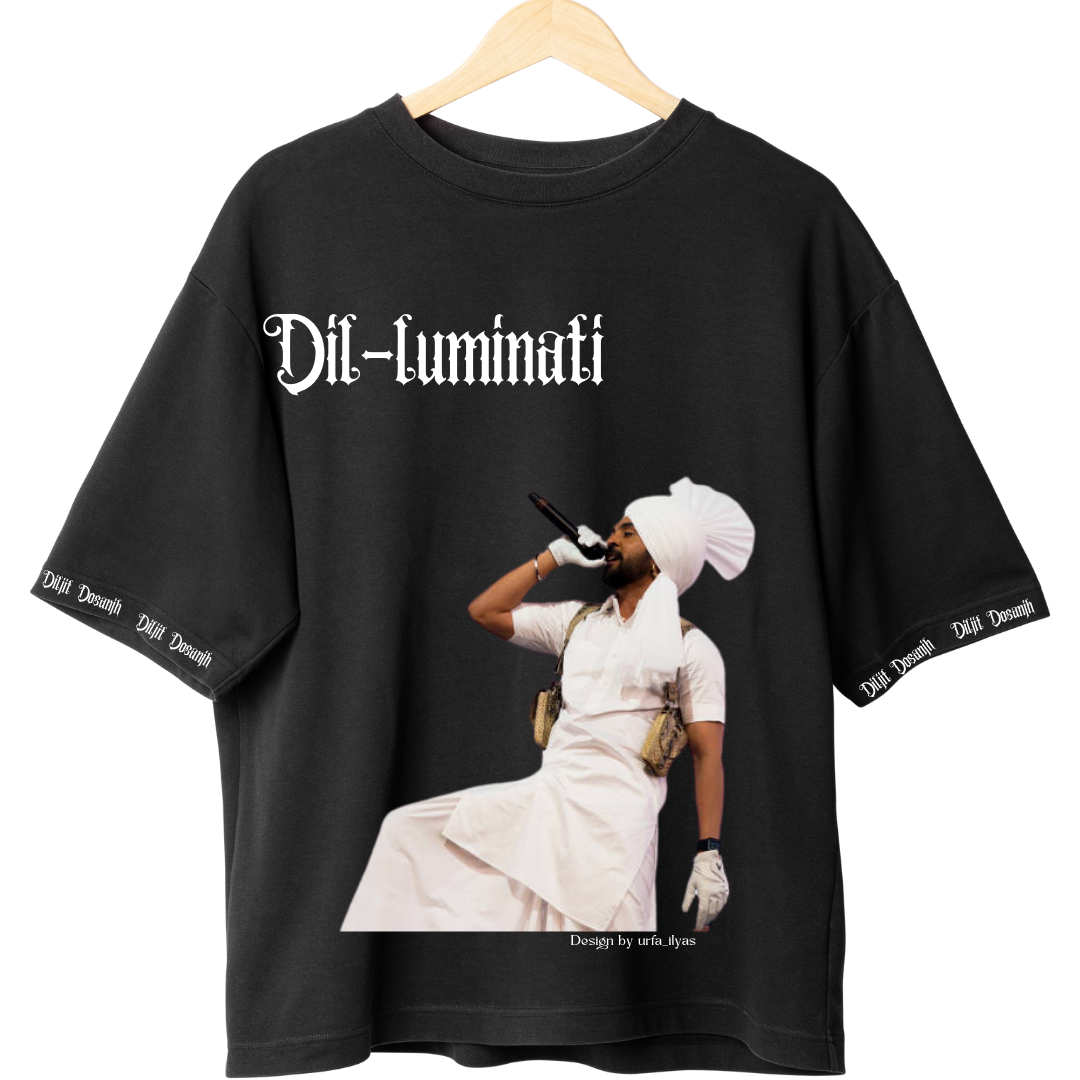 The t-shirt’s design, featuring Diljit in his trademark traditional Punjabi attire with the word Dil-luminati boldly emblazoned across the front, captures the essence of the star’s signature style. From the turban to the white kurta, this tee serves as a nod to his undeniable impact on both the Punjabi music scene and international pop culture. The attention to detail is further evident in the sleeve design, which showcases the iconic official Dill Luminati tour merch by Diljit Dosanjh name repeatedly, reinforcing the boldness and exclusivity of this merchandise.