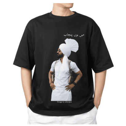 This t-shirt brings together the best of both worlds—modern streetwear and traditional Punjabi elements. The black base of the shirt, combined with the crisp white imagery and Punjabi text, makes for a visually striking and versatile design. It can easily be paired with casual outfits or used as a statement piece.